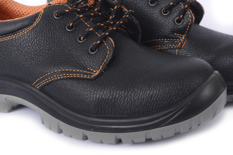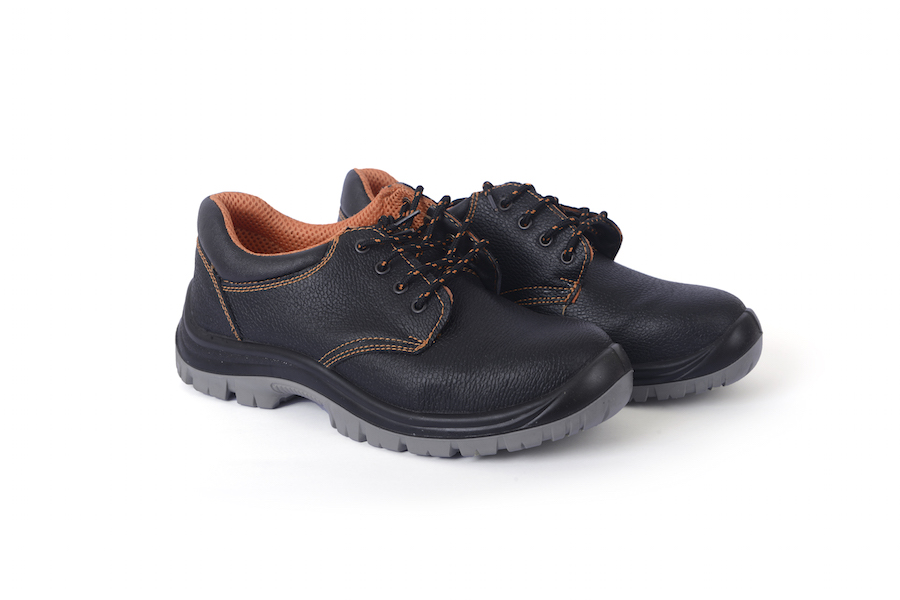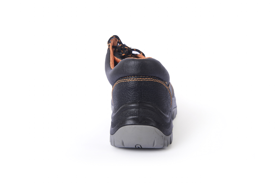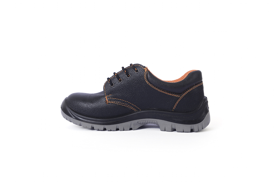 Upper part is shiny black leather, model: shallow shoe, has steel cap and insole, double layer PU sole, anti-static. Orange thread and lining. Steel cap an insole